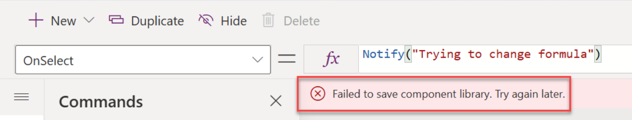 Desabilitar personalizações impede a edição de fórmulas do Power Fx em Visibility e OnSelect, mas não restringe atualizações em outras propriedades do comando, como Display Label. Essa restrição só entra em vigor após exportar a solução como gerenciada e importá-la em outro local. Se você tentar alterar a biblioteca de componentes após a importação dela como gerenciada, o seguinte erro será exibido: