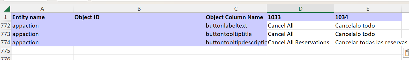 CrmTranslations.xmlno Excel. - Na planilha Rótulos Localizados, role para baixo até as linhas em que Nome da Entidade contém "appaction".