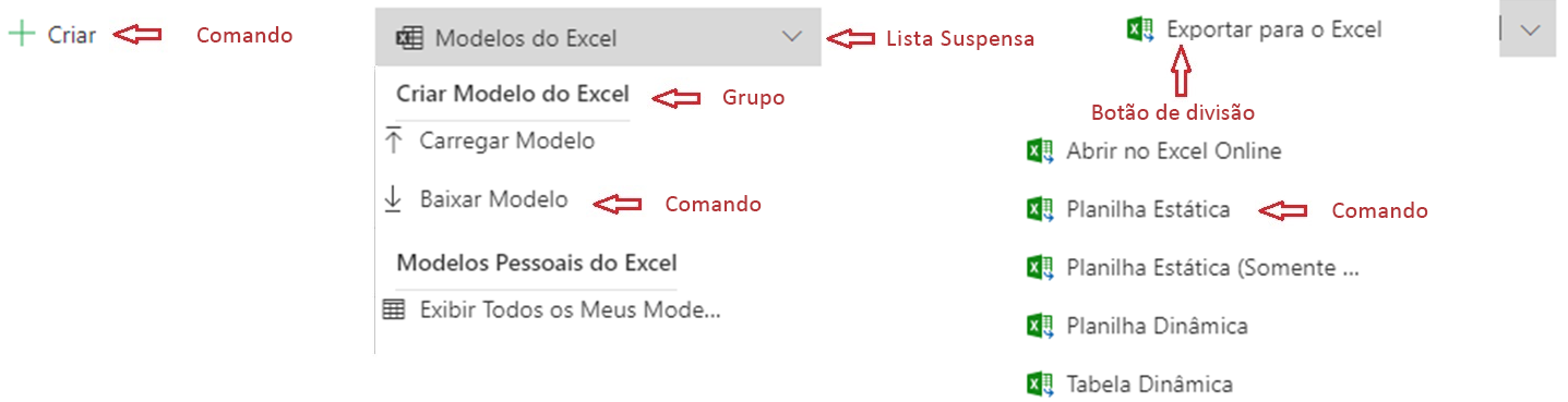 Grupo: usado para rotular e conter um ou mais comandos em uma lista suspensa ou um botão de divisão.