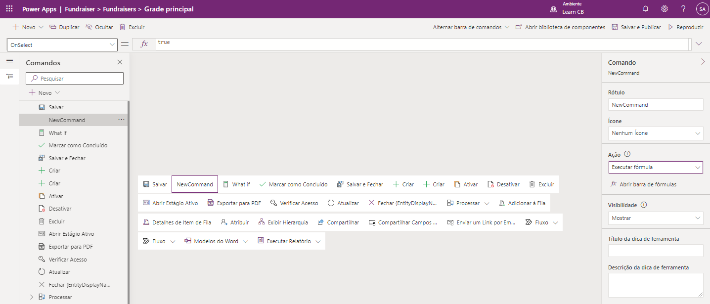 A ação do comando permite implementar uma lógica personalizada que é executada quando o usuário seleciona o comando. A lógica do comando pode executar ações como modificar valores no formulário, ou criar ou modificar outras linhas de dados. A lógica de ação de um comando tem os itens selecionados atuais disponíveis para ele e pode usar os valores de coluna de item na lógica.
