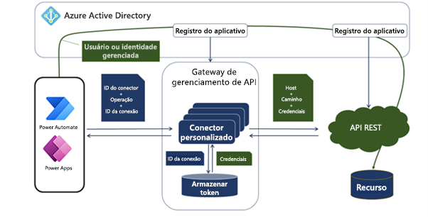 A principal diferença é que o conector personalizado e o serviço de aplicativo de destino são registrados como os aplicativos no Azure AD. Esse fator permite que os fabricantes apliquem as permissões apropriadas e, em seguida, passem a identidade do usuário de chamada de um aplicativo em Power Apps, fluxo do Power Automate ou fluxo de trabalho de Aplicativos Lógicos para o serviço subjacente.
