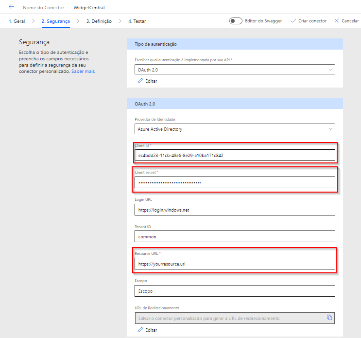 Defina o conector fornecendo as informações de ID do cliente, segredo e URL de recurso.