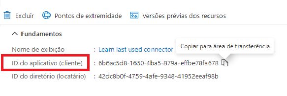 Copie a ID do Aplicativo (Cliente) e salve-a no bloco de notas. Você usará essa ID do cliente ao criar o conector.