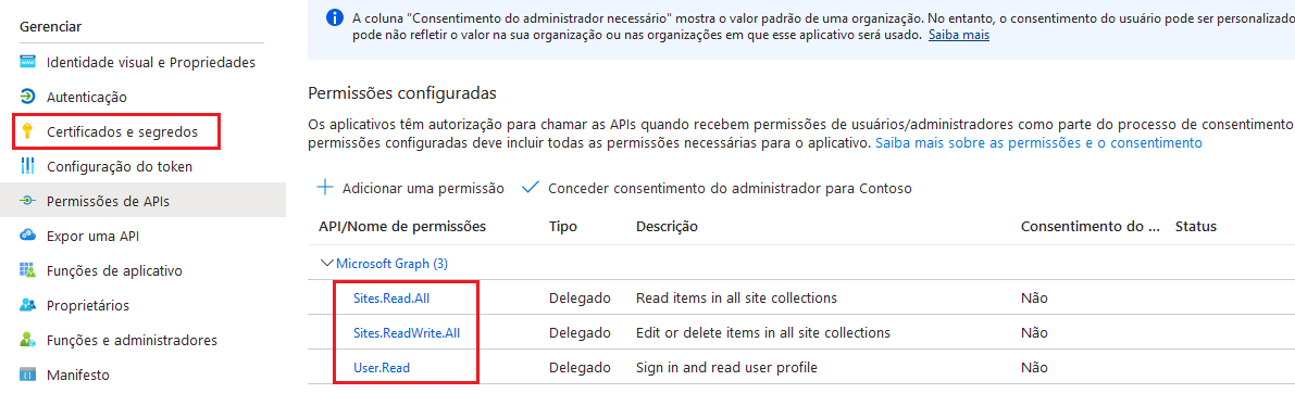 Agora você deve ter três permissões de API. Selecione Certificados e segredos.