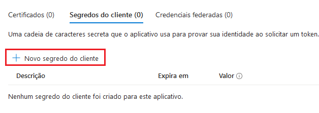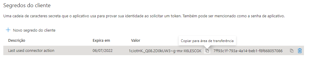 Copie o Valor e salve-o para mais tarde, pois ele não será mostrado novamente. Você usará esse segredo de usuário ao criar o conector.