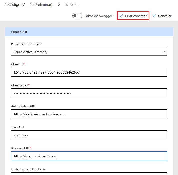 https://graph.microsoft.comem URL do Recurso e selecione Criar conector.Não saia desta página.