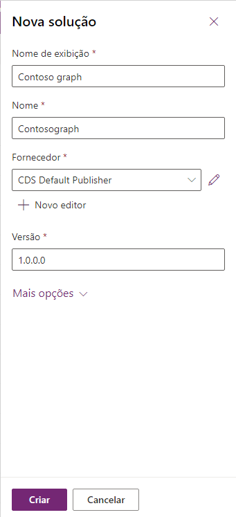 Insira Diagrama da Contoso em Nome de exibição, selecione Editor Padrão de CDS para Editor e, depois, Criar. Observação: Quando estiver trabalhando em um projeto real, é melhor criar seu próprio editor.