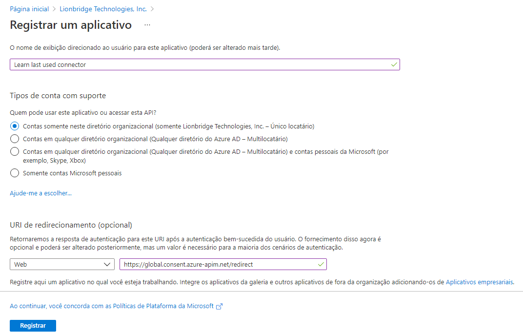 Nesta tarefa, você configurará um novo aplicativo que será usado para acessar a API do Graph pelo conector personalizado. Você também configurará permissões para as ações específicas da API do Graph, assim como o fez ao modificar permissões no Explorador do Graph.