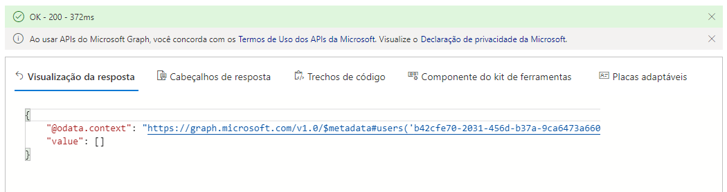 Nesta tarefa, você usará o Explorador do Graph para executar uma ação da API que será configurada no conector personalizado.