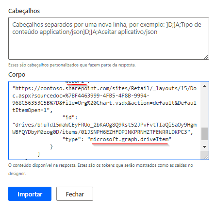 Cole a resposta copiada do Explorador do Graph no campo Corpo e selecione Importar.