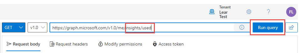 Selecione GET para o verbo, adicione /insights/used à URL e selecione Executar consulta.