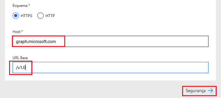 Role para baixo, digite graph.microsoft.com em Host e /v1.0 para URL Base.
