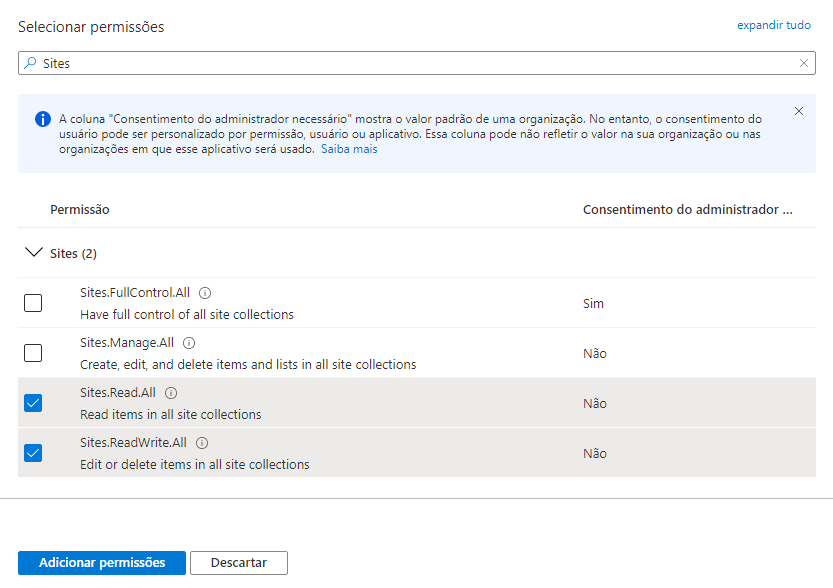 Selecione Sites.Read.All, Sites.ReadWrite.All e Adicionar permissões.