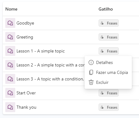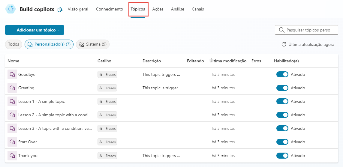 Tópicos de exemplo estão incluídos nos novos agentes. Eles precisam ser removidos. Você também pode desabilitar tópicos do sistema desnecessários.