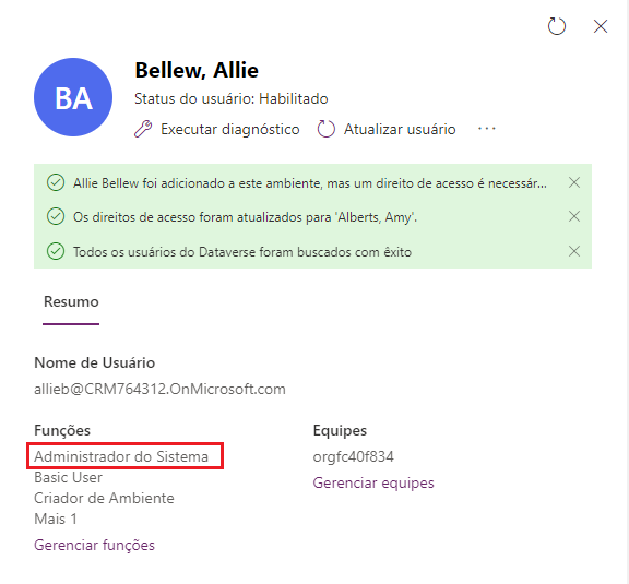 Em seguida, selecione Salvar para atualizar as atribuições para o usuário nesse ambiente. O painel do usuário reaparece e lista a função atualizada de Administrador do Sistema abaixo de Funções.