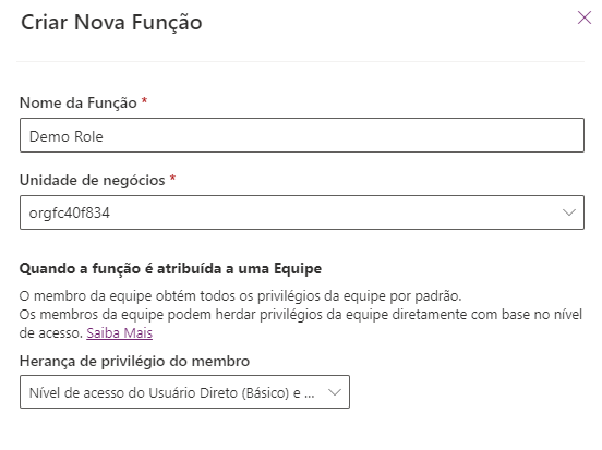 Um painel Criar nova função é exibido no lado direito da tela. Adicione um Nome de Função, selecione uma Unidade de negócios e selecione Salvar. (Você pode alterar as opções de Herança de privilégio do membro, mas esta etapa é desnecessária.) Isso cria uma função com um nível mínimo de permissões no ambiente. A próxima etapa consiste em dar acesso aos dados.