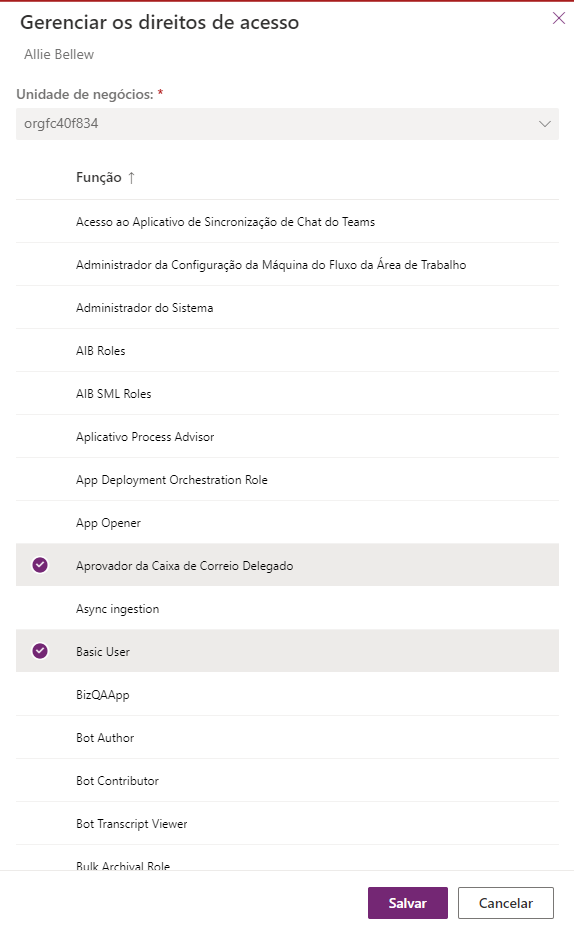 Os direitos de acesso do usuário controlam o acesso aos dados de um usuário por meio de um conjunto de níveis de acesso e permissões. A combinação das permissões e dos níveis de acesso que estão incluídos em um direito de acesso define limites para a exibição e interações do usuário com esses dados. Ao criarmos nosso ambiente anteriormente neste módulo, poderíamos adicionar um direito de acesso existente.