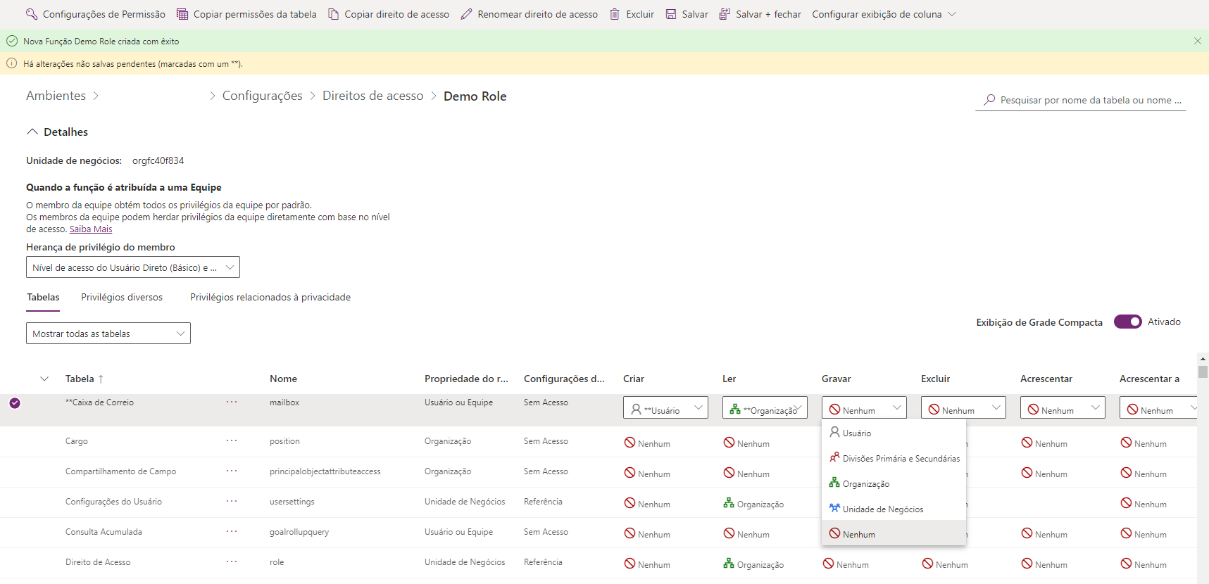 O novo painel de função desaparece, e agora a tela mostra uma tela de permissões com uma lista de tabelas para personalização da nova função. Você pode personalizar o comportamento dessa função em tabelas individuais. Selecione uma tabela e ajuste qualquer uma das permissões nas várias opções, inclusive Criar, Ler, Gravar, Excluir, Acrescentar, Acrescentar a, Atribuir e Compartilhar. O campo de pesquisa no canto superior direito da tela pode auxiliar a encontrar rapidamente qualquer tabela que você esteja procurando.