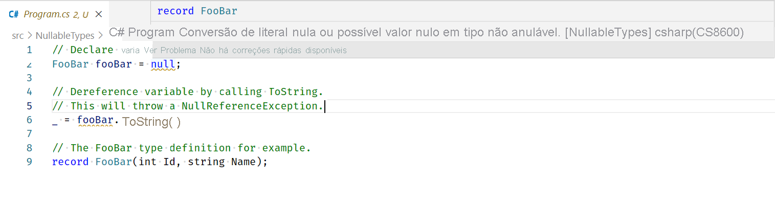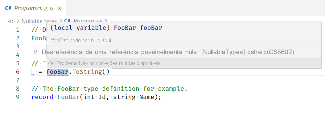 _ = fooBar.ToString();também tem um aviso. Desta vez, o compilador está preocupado quefooBarpossa ser nulo: Aviso CS8602: Desreferência de uma referência possivelmente nula.