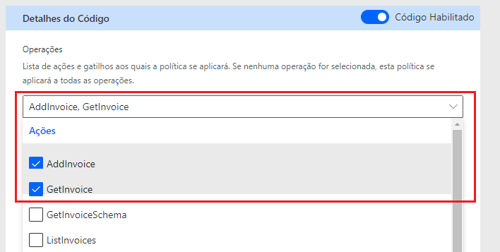 Você também pode controlar em quais operações o código personalizado é executado, definindo-o para ser executado em operações específicas. Por padrão, após a habilitação do código, todas as operações executarão o código personalizado. A imagem a seguir mostra que apenas AddInvoice e GetInvoice executam o código personalizado.