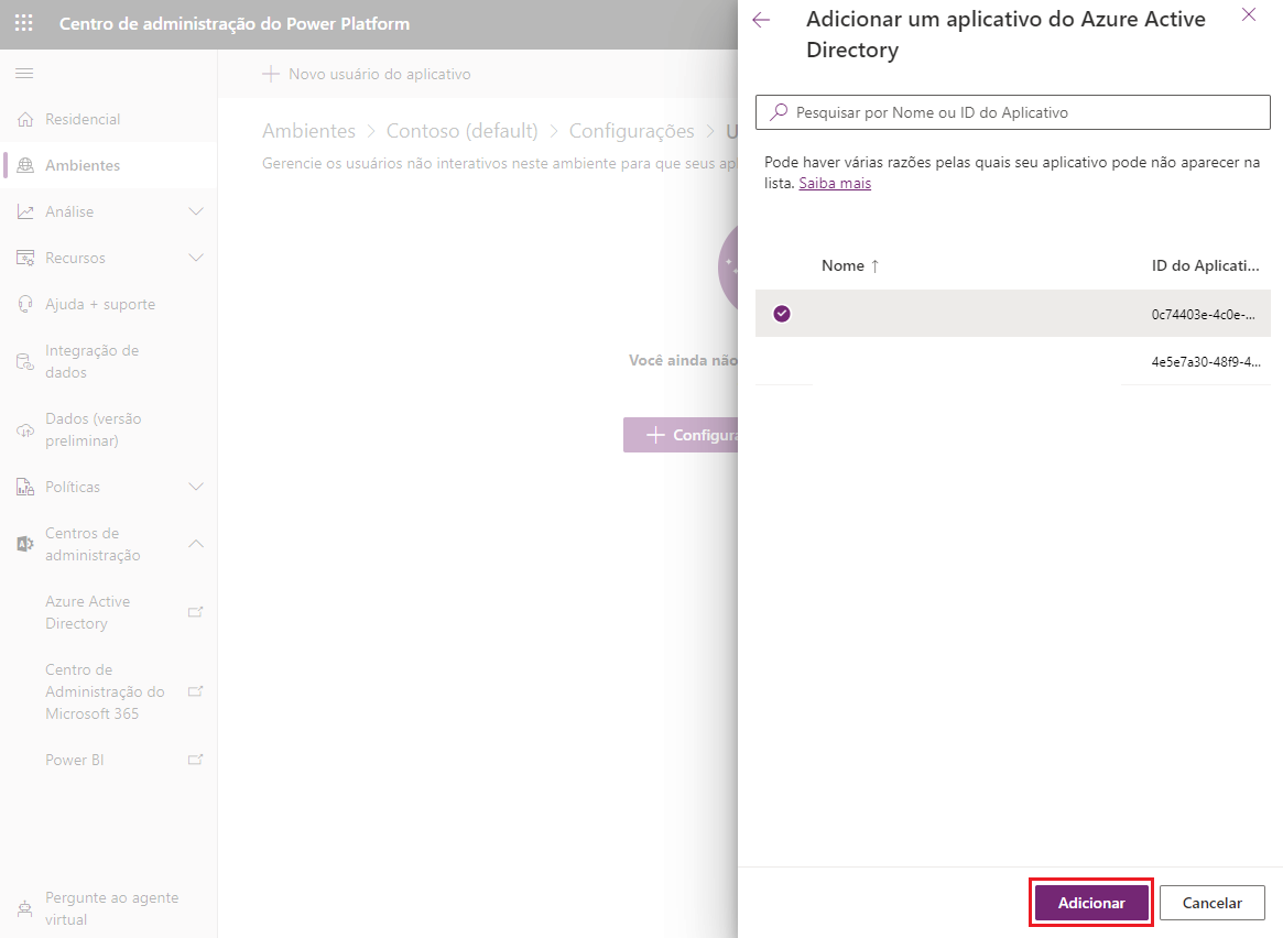 A configuração de Usuários de Aplicativos do Dataverse é feita por meio do Centro de administração do Power Platform como um Administrador do Sistema.