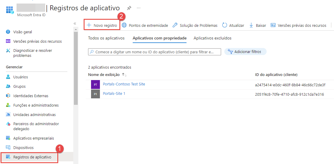 Para registrar um aplicativo com o Entra ID, vá para a seção Registros de Aplicativo do menu Entra ID (Azure Active Directory) e selecione Novo Registro.