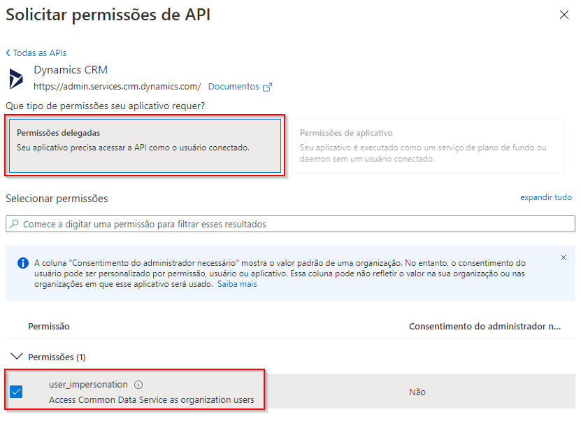 Se seu aplicativo acessar o Dataverse em nome de um usuário conectado, acesse a guia Permissões da API no aplicativo registrado e verifique se conceder a seu aplicativo acesso de representação de usuário a seu ambiente do Dataverse.