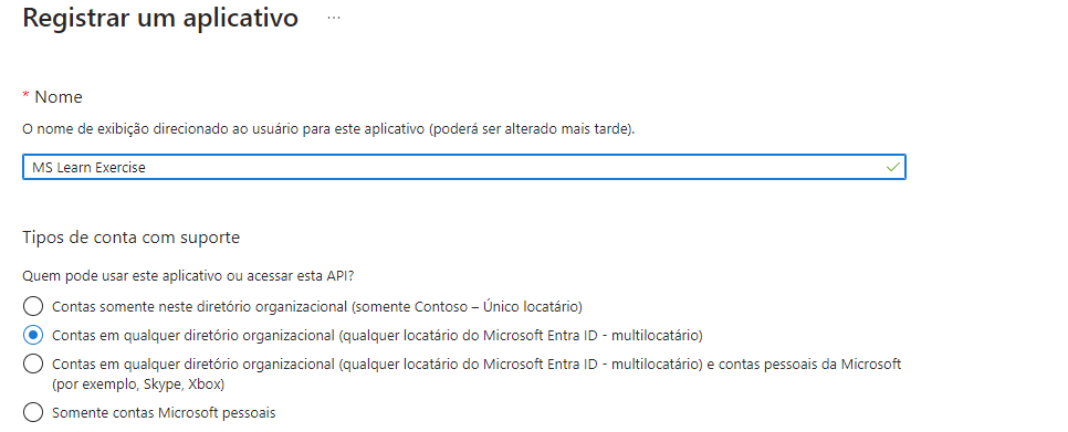 Contas em qualquer diretório organizacional (qualquer diretório do Entra ID – Multilocatário) e contas Microsoft pessoais (por exemplo, Skype e Xbox)