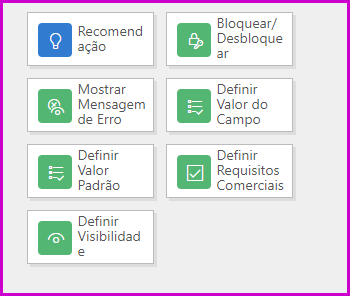 | Recomendação | Mostra um ícone de lâmpada próximo ao rótulo da coluna. Quando o ícone é selecionado, o usuário é acionado. Se o prompt for aceito, a regra poderá definir valores de campo. | Aplicativo baseado em modelo |
