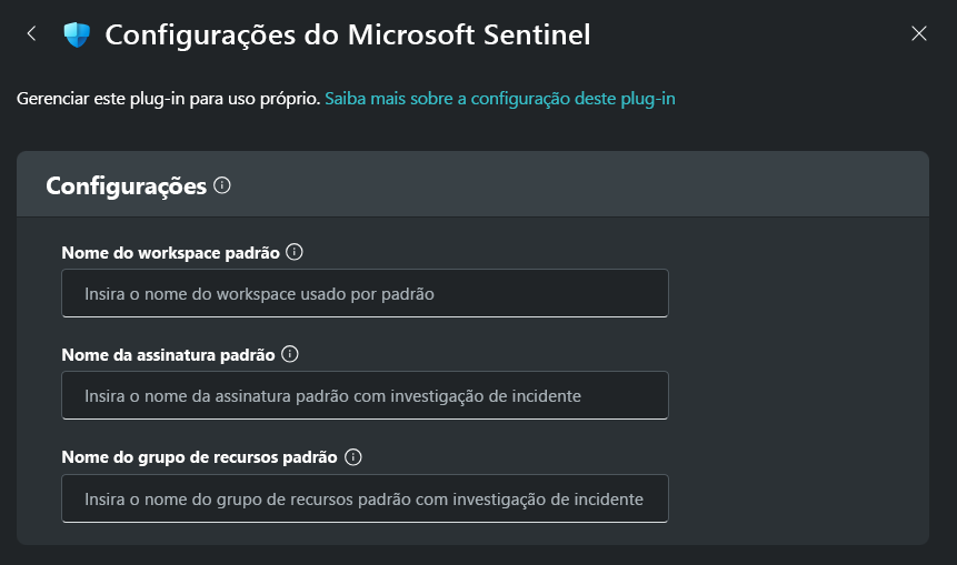 O plugin do Sentinel requer que o usuário configure o workspace do Sentinel, o nome da assinatura e o nome do grupo de recursos.