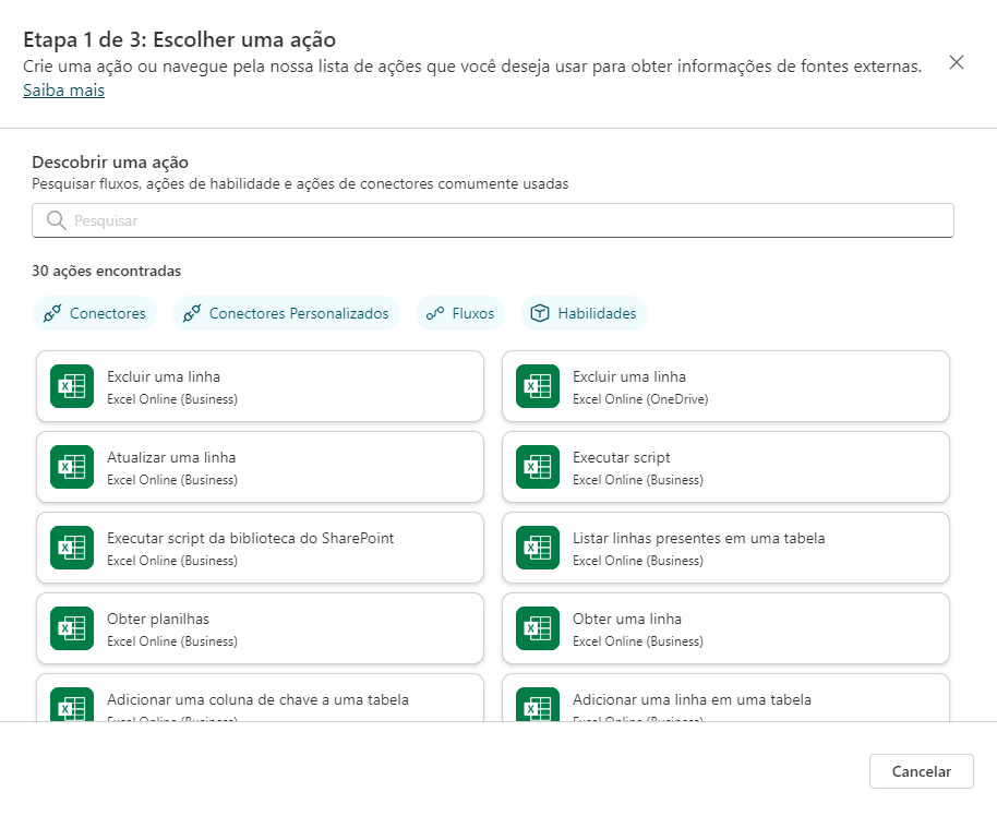 Você também verá conectores personalizados e fluxos da nuvem do Power Automate em seu ambiente listados ao criar uma nova ação.