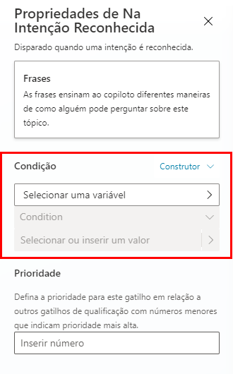 Por padrão, os tópicos usam o gatilho Frases, que é ativado quando uma ou mais de suas frases de gatilho correspondem a uma mensagem recebida de um usuário. Há outros tipos de gatilhos disponíveis que determinam quando um tópico deve ser executado.