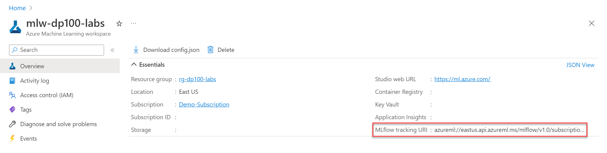 Captura de tela da página de visão geral no portal do Azure mostrando o URI de acompanhamento do MLflow.