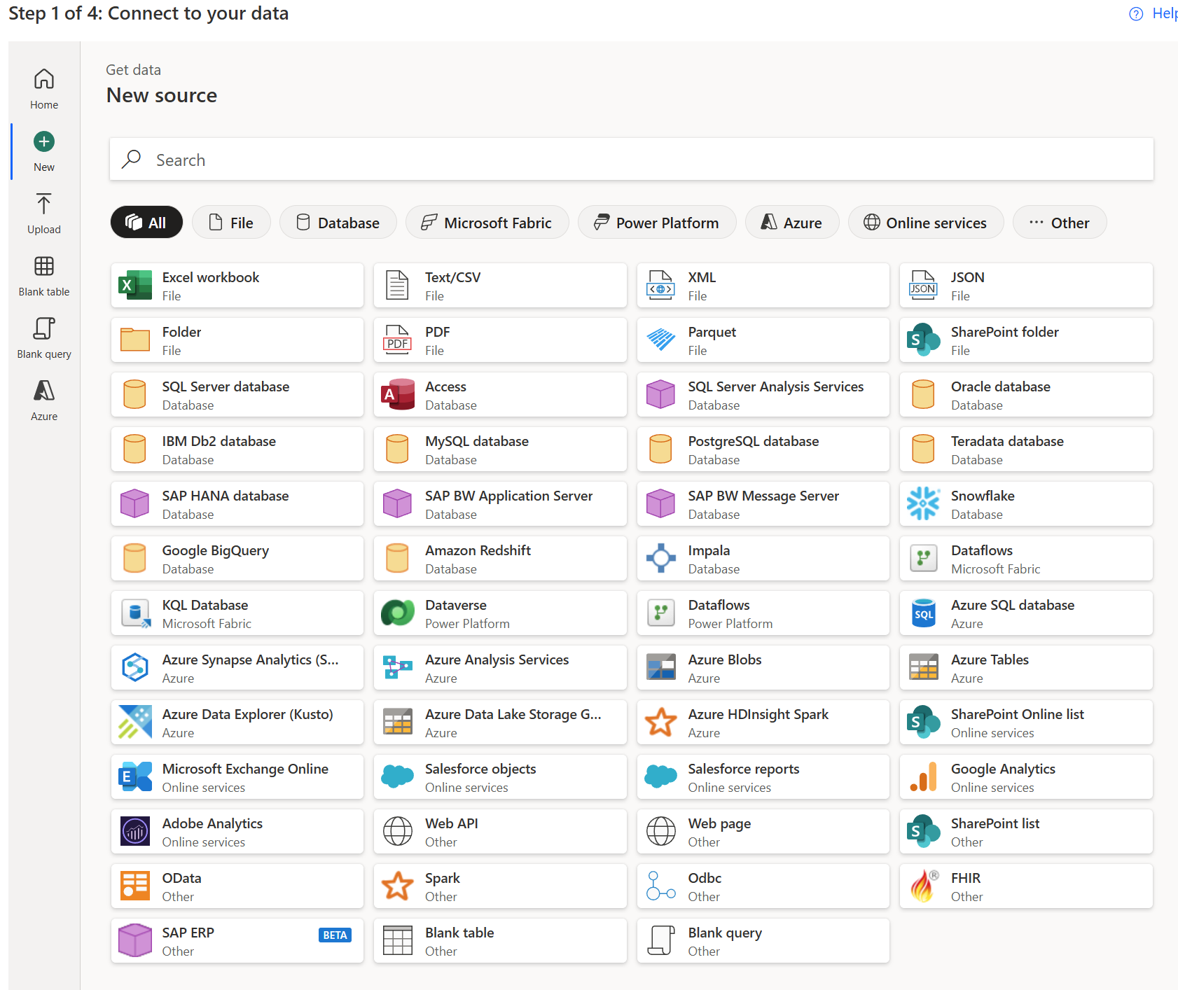 Usando a opção Começar do zero, você pode se conectar a uma das várias fontes de dados usando os conectores fornecidos.