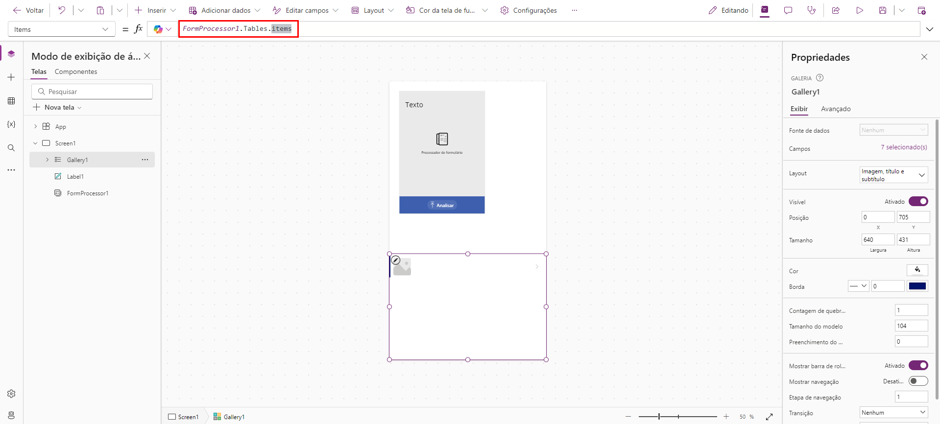 FormProcessor1.Fields.Esse código dá acesso a outras propriedades do modelo também. Para este exercício, vamos escolher invoiceId. A fórmula do rótulo agora deve ser:FormProcessor1.Fields.invoiceIdEm seguida, vamos adicionar uma galeria para que possamos ver os dados da tabela de itens da fatura. Selecione Inserir e, depois, Galeria Vertical. Redimensione e posicione a galeria para que ela fique abaixo do rótulo.