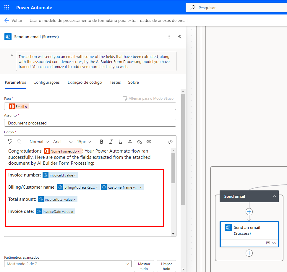Vamos alterar esse fluxo gerado automaticamente para nos mostrar algumas das informações que o treinamos para extrair. Expanda a etapa final Enviar um email (Sucesso) sob o botão Enviar email de sucesso. Exclua a linha no Corpo que inclui Total...(Pontuação de confiança:...)