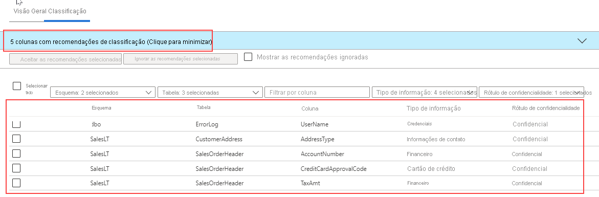 No exemplo, há cinco colunas recomendadas para classificação. As propriedades Tipo de Informação e Rótulo de Sensibilidade parecem consistentes com o nome da coluna e a finalidade geral. No entanto, como as recomendações são baseadas no nome da coluna, uma coluna chamada column1 que contém endereços de email não seria recomendada como informações pessoais confidenciais.