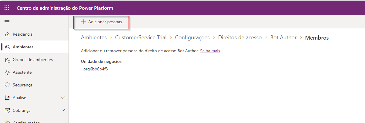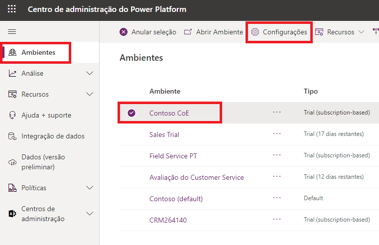 Para atribuir o direito de acesso de "autor do agente", o administrador do Microsoft Power Platform deve acessar o Centro de administração do Microsoft Power Platform, selecionar o ambiente e escolher Configurações.