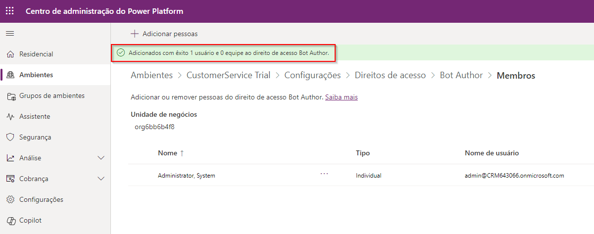 Você concedeu acesso de criador de agente a um usuário em um ambiente.