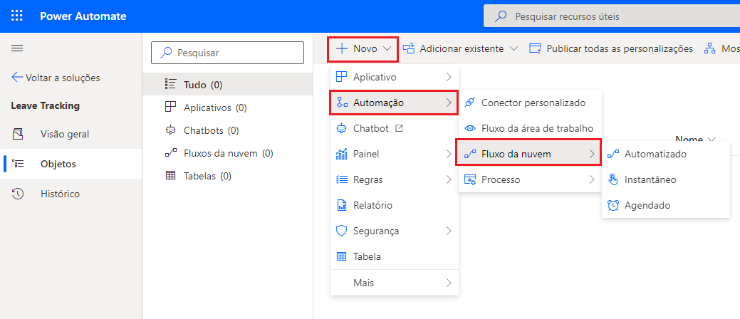 Você pode criar novos fluxos da nuvem diretamente em uma solução ou pode adicionar fluxos existentes. Para adicionar novos fluxos da nuvem diretamente, inicie a solução de sua escolha e selecione + Novo.