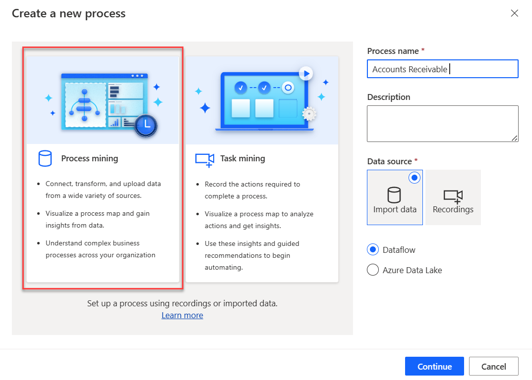 A otimização de um novo processo começa identificando o nome do processo, o tipo de análise de processo que você deseja executar e como deseja se conectar aos dados do log de eventos.