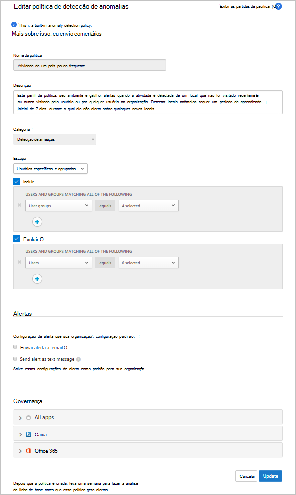 Cada política de detecção de anomalias pode ter um escopo independente para que se aplique apenas aos usuários e grupos que você deseja incluir e excluir na política. Por exemplo, pode definir a Atividade da deteção de país/região pouco frequente para ignorar um utilizador específico que viaja frequentemente.