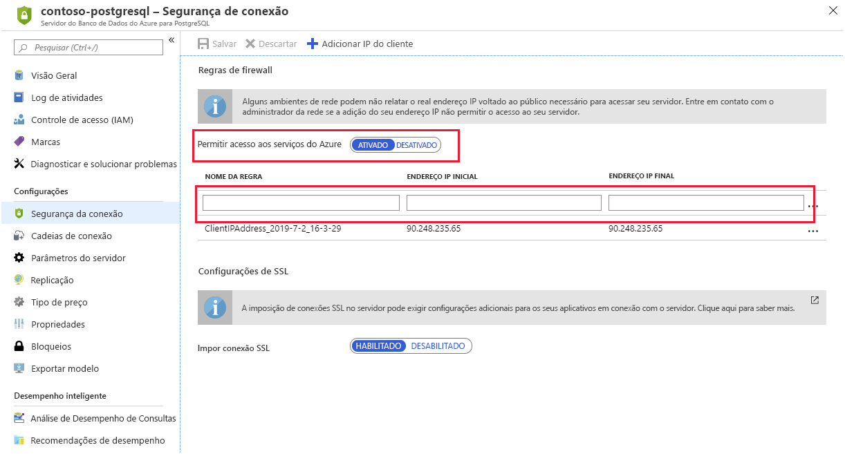 O Banco de Dados do Azure para PostgreSQL é executado por trás de um firewall. Para acessar seu serviço e banco de dados, você deve adicionar uma regra de firewall para os intervalos de endereços IP dos quais seus clientes se conectam. Se você precisar acessar o serviço pelo Azure, como um aplicativo em execução usando os Serviços de Aplicativos do Azure, você também deve habilitar o acesso aos serviços do Azure.