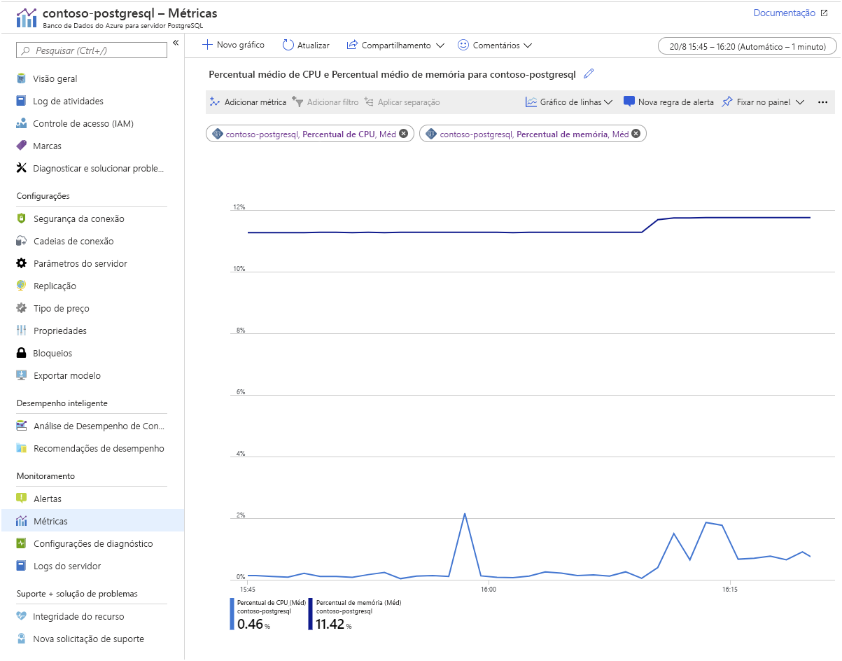 Azure Monitor. O Banco de Dados do Azure para PostgreSQL oferecem métricas que permitem controlar itens como utilização de CPU e armazenamento, taxas de E/S, ocupação de memória, número de conexões ativas e atraso de replicação: