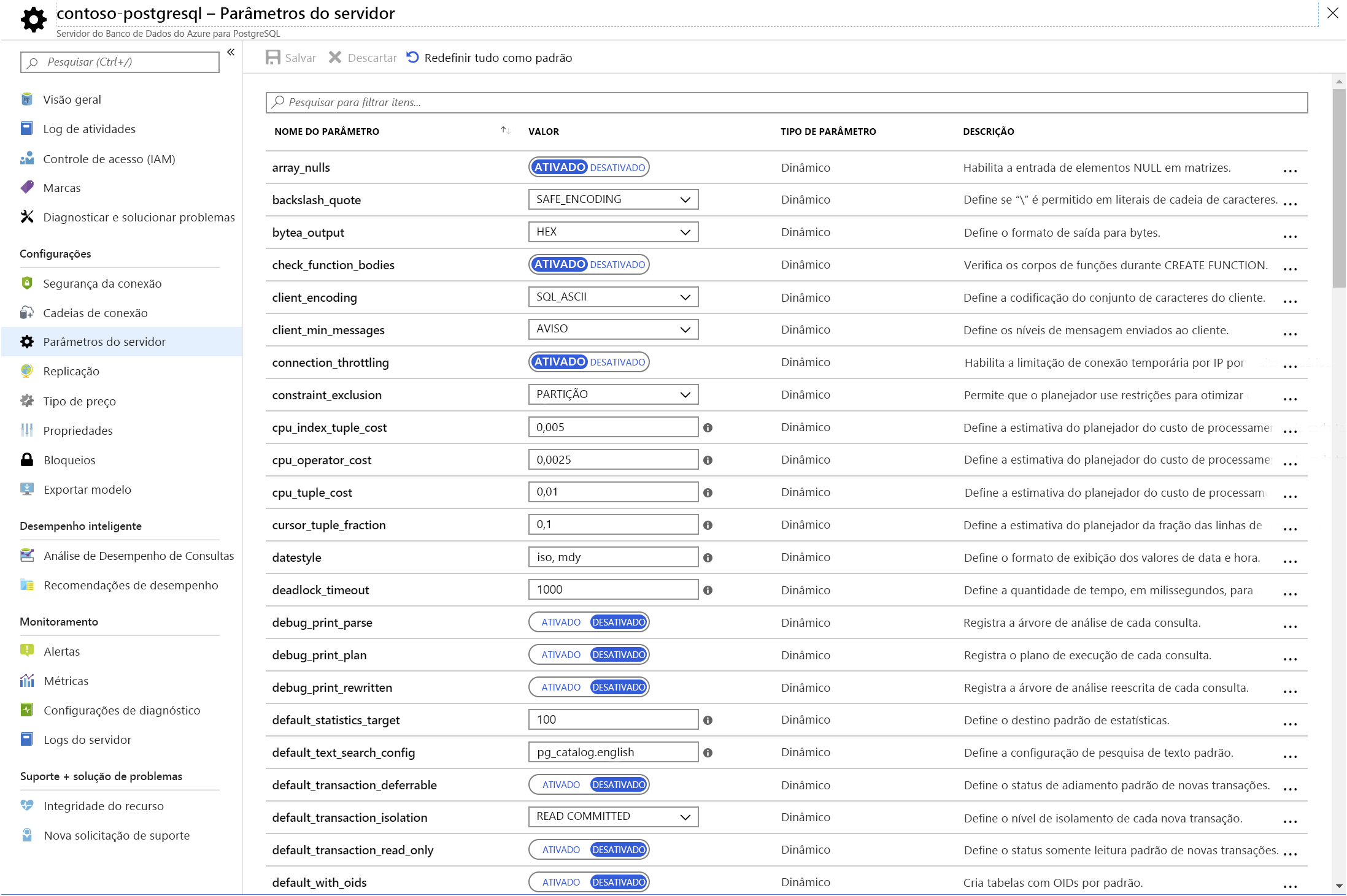 Em uma instalação local do PostgreSQL, você define parâmetros de configuração de servidor no arquivo postgresql.conf . Use o Banco de Dados do Azure para PostgreSQL para modificar parâmetros de configuração por meio da página de parâmetros do servidor . Nem todos os parâmetros para uma instalação local do PostgreSQL são relevantes para o Banco de Dados do Azure para PostgreSQL, portanto, a página de parâmetros do servidor lista apenas os parâmetros que são apropriados para o Azure.