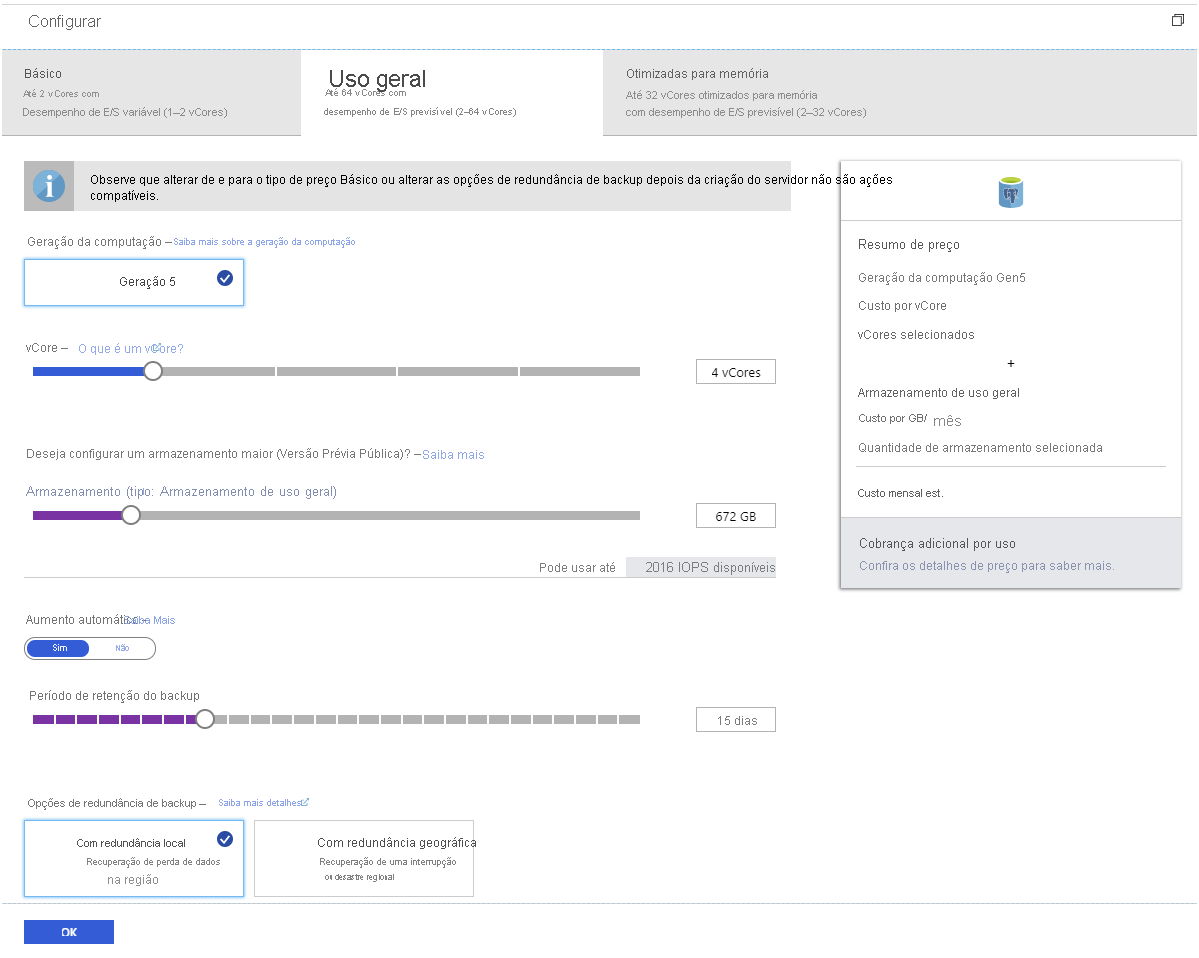 - Uso geral, que fornece desempenho previsível, até 6.000 IOPS, dependendo do número de núcleos de processador e do espaço de armazenamento disponível.