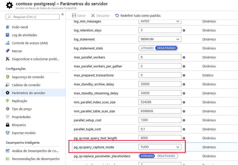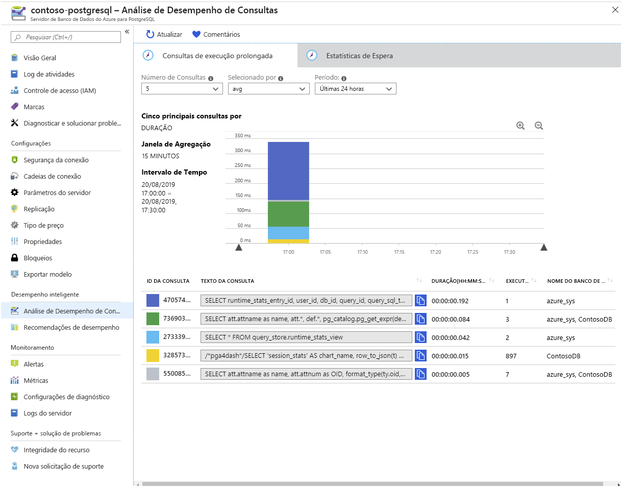 Repositório de Consultas e Análise de Desempenho de Consultas. O Banco de Dados do Azure para PostgreSQL armazena informações sobre as consultas executadas em bancos de dados no servidor e as salva em um banco de dados chamado azure_sys, no esquema query_store . Consulte a exibição query_store.qs_view para ver essas informações. Por padrão, o Banco de Dados do Azure para PostgreSQL não captura nenhuma informação de consulta, pois impõe uma pequena sobrecarga, mas você pode habilitar o acompanhamento definindo a propriedade de servidor pg_qs.query_capture_mode como ALL ou TOP.