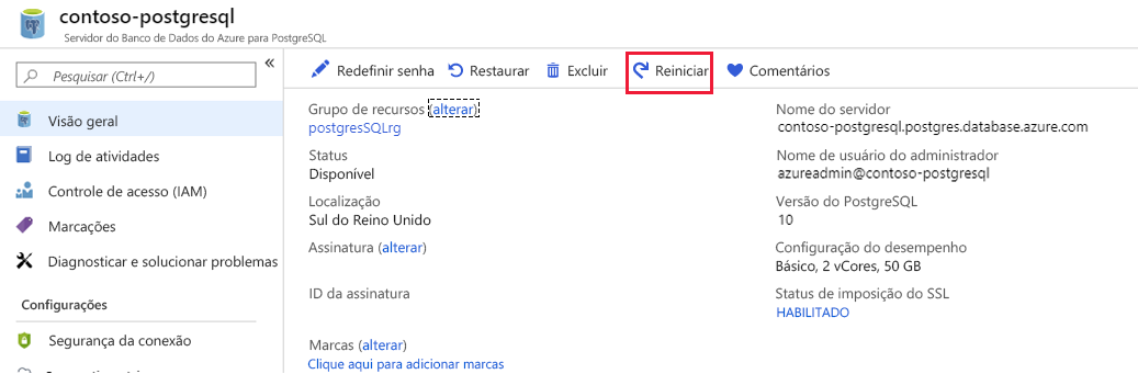 Alterações nos parâmetros marcados como Dinâmicos entram em vigor imediatamente. Os parâmetros estáticos exigem uma reinicialização do servidor. Reinicie o servidor usando o botão Reiniciar na página Visão geral no portal: