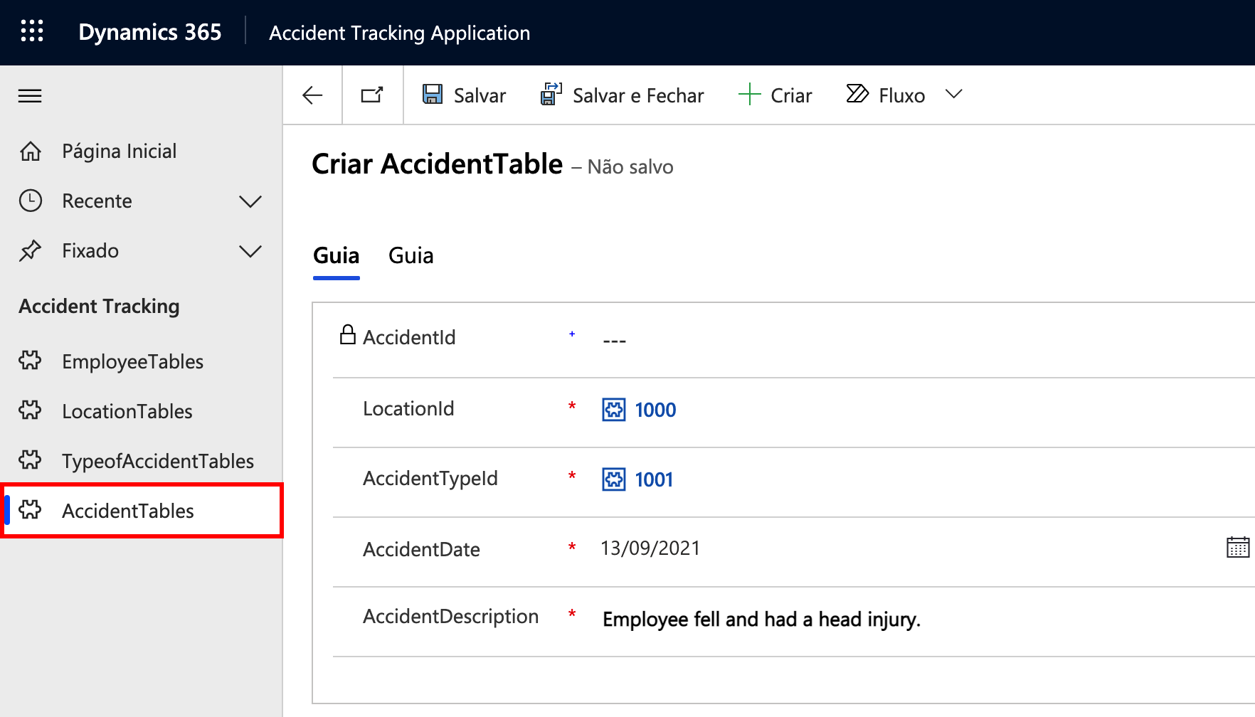 Formulário de rastreamento de incidentes: use esse formulário como o principal local em que os gerentes podem registrar informações sobre acidentes de funcionários. Esse formulário usa dados de todos os formulários anteriores.