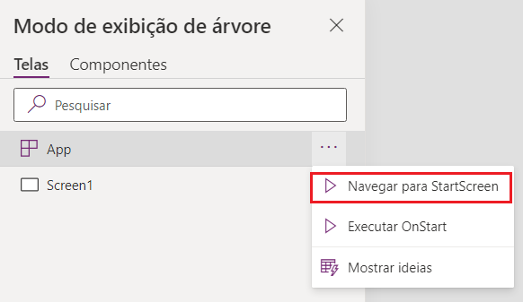 A propriedade StartScreen é avaliada uma vez na inicialização. Se for necessário testar posteriormente, você poderá alterar a propriedade. Como alternativa, você pode forçá-la manualmente a ser reavaliada usando o comando de menu de contexto Navegar para StartScreen para o objeto de aplicativo.